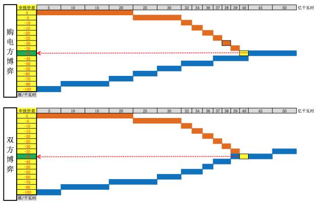 (3)當(dāng)購(gòu)電方(大用戶和售電公司)博弈的時(shí)候,成交價(jià)偏低,為-40厘;這和雙方都博弈的價(jià)格一樣;