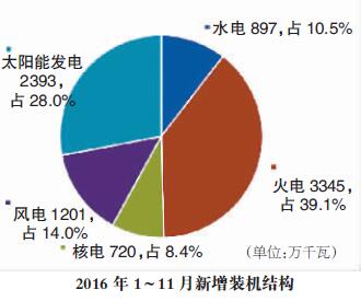 受煤電政策、環(huán)境約束等因素影響,2016年1~11月,全國(guó)新增裝機(jī)規(guī)模同比下降了5.4%,為8557萬(wàn)千瓦。其中,火電新增裝機(jī)同比下降了30%,非化石能源新增裝機(jī)同比增長(zhǎng)21%,比重進(jìn)一步提升至60.9%,創(chuàng)下歷史新高。預(yù)計(jì)全年新增裝機(jī)規(guī)模將達(dá)到1.3億千瓦,同比下降1.7%。其中,非化石能源新增裝機(jī)比重為61.1%。期末總裝機(jī)容量達(dá)到16.5億千瓦,同比增長(zhǎng)8.5%,非化石能源裝機(jī)比重達(dá)到36.2%,較2015年提高了2.1個(gè)百分點(diǎn)。