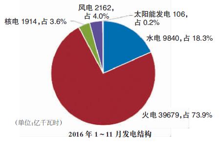 受電力需求回暖的帶動(dòng),2016年1~11月,全國(guó)發(fā)電量約5.4萬(wàn)億千瓦時(shí),同比增長(zhǎng)4.2%,增速較2015年同期提高了4.1個(gè)百分點(diǎn)。其中,火電發(fā)電量同比增長(zhǎng)2.2%,增速同比提高4.6個(gè)百分點(diǎn)。風(fēng)電、核電發(fā)電量同比分別增長(zhǎng)30.3%和20.5%,發(fā)電比重分別達(dá)到4%、3.6%。