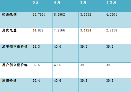 2017年4月21日,開(kāi)展了5月月度集中競(jìng)價(jià)交易,采用邊際價(jià)格統(tǒng)一出清方式,交易規(guī)模15.7954億千瓦時(shí),成交電量14.882億千瓦時(shí)。發(fā)電側(cè)邊際成交申報(bào)價(jià)格39.3分/千瓦時(shí),用戶側(cè)邊際成交申報(bào)價(jià)格39.5分/千瓦時(shí),統(tǒng)一出清價(jià)格39.4分/千瓦時(shí)。