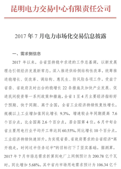 6月20日,昆明電力交易中心發(fā)布了《2017年7月電力市場(chǎng)化交易信息披露》,披露中稱(chēng),據(jù)測(cè)算,2017年7月市場(chǎng)總需求折算到電廠上網(wǎng)側(cè)預(yù)計(jì)為200 78億千瓦時(shí),同比增加5 68%。其中省內(nèi)市場(chǎng)用電需求預(yù)計(jì)為106 34億千瓦