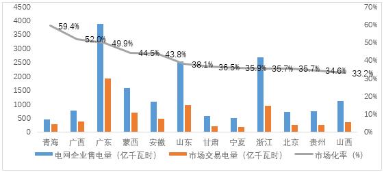 分省來(lái)看,全國(guó)市場(chǎng)交易電量規(guī)模排序前三名的省份分別為廣東省1940億千瓦時(shí)(含西電東送省間協(xié)議電量)、江蘇省1160億千瓦時(shí)和山東省970億千瓦時(shí)。外受電市場(chǎng)交易電量排序前三名的省份分別是廣東省1332億千瓦時(shí)(含西電東送省間協(xié)議電量)、浙江省363億千瓦時(shí)和山東省286億千瓦時(shí)。全國(guó)銷售電量市場(chǎng)化率排序前三名的省份是青海、廣西、廣東,分別為59.4%、52.0%、49.9%。
