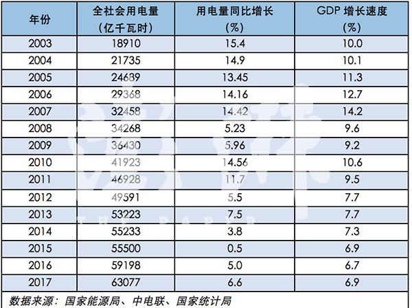 2003-2017年電力消費增速與GDP增速
