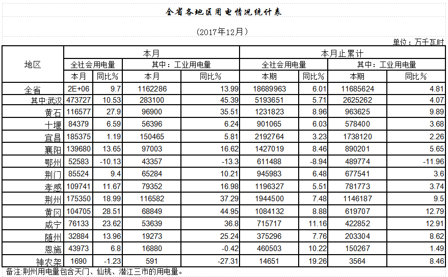 (五)全省各地區(qū)用電普遍增長,“一主兩副”城市增速穩(wěn)健。全省14個(gè)用電統(tǒng)計(jì)地區(qū)中,武漢等13個(gè)地區(qū)全社會(huì)用電同比增長,其中咸寧、恩施、神農(nóng)架林區(qū)3地全社會(huì)用電增幅在兩位數(shù)以上。各地工業(yè)用電基本與全社會(huì)用電同步增長,僅鄂州市受鋼鐵行業(yè)淘汰落后產(chǎn)能影響工業(yè)用電下降。“一主兩副”城市武漢、宜昌、襄陽3市全社會(huì)用電量占到全省的47.16%,工業(yè)用電量占全省的44.63%,3市全社會(huì)和工業(yè)用電均增幅穩(wěn)健,有力促進(jìn)了全省用電的增長。