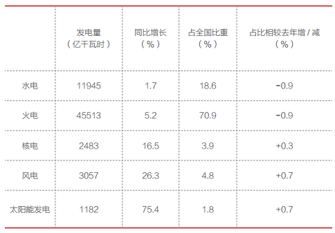 非化石能源發(fā)電量為1.94萬億千瓦時,增長10%,占總發(fā)電量比重為30.2%,比上年提高1個百分點。