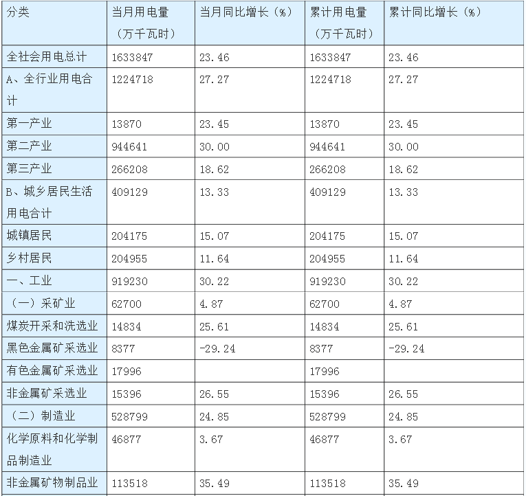 各行業(yè)用電量當月及累計增長情況具體見下表: