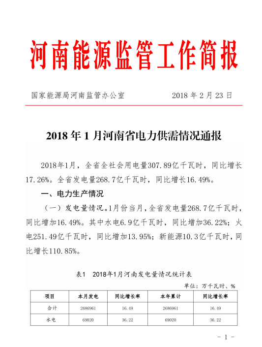 國(guó)家能源局河南監(jiān)管辦發(fā)布了《2018年1月河南省電力供需情況通報(bào)》,2018年1月,全省全社會(huì)用電量307.89億千瓦時(shí),同比增長(zhǎng)17。26%。全省發(fā)電量268.7億千瓦時(shí),同比增長(zhǎng)16.49%。