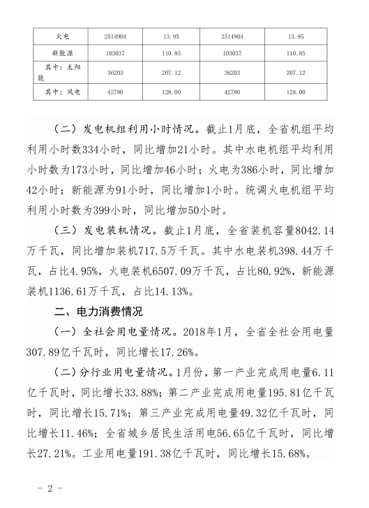 2018年1月河南省電力供需情況:全社會(huì)用電量307.89億千瓦時(shí)