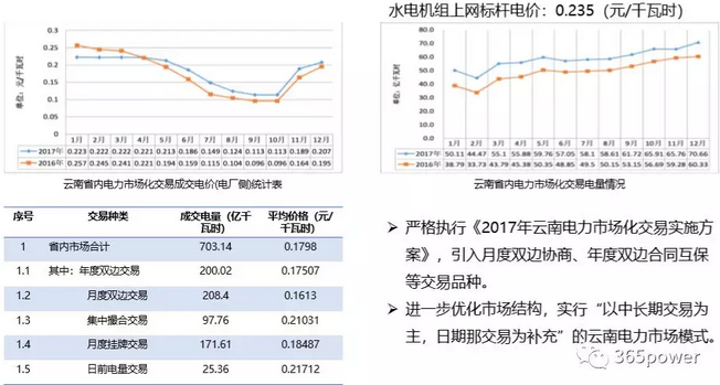 2017年,云南省內(nèi)市場共成交電量703.14億千瓦時,其中年度、月度、日前交易電量比例為28%、69%、3%,“以中長期交易為主,日期那交易為補充”的市場模式愈加成熟。全年電力市場整體呈現(xiàn)“電量穩(wěn)步增長”狀態(tài),由于云南以水力發(fā)電為主,受汛期影響5-10月份電價逐步降低,汛期結(jié)束電價回歸正常??傮w來看,電力市場進入良好的可持續(xù)發(fā)展狀態(tài)。