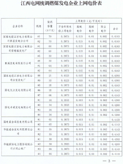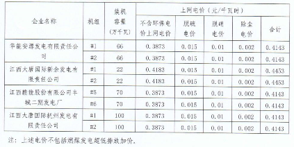 適當(dāng)提高燃煤發(fā)電上網(wǎng)電價(jià):自2017年7月1日起,江西省燃煤發(fā)電標(biāo)桿上網(wǎng)電價(jià)每千瓦時(shí)提高1.5分錢(含稅,下同),提高后為0.4143元/千瓦時(shí)(含脫硫、脫硝和除塵電價(jià),不包括超低排放電價(jià),下同)。