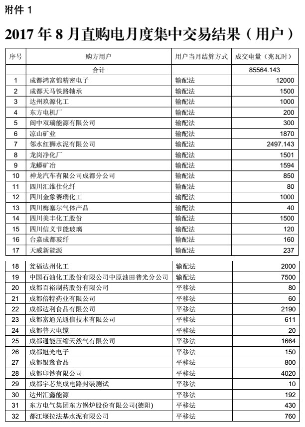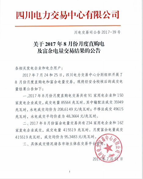 從四川電力交易中心獲悉,2017年7月24日和25日,四川電力交易中心分別組織開展了8月份月度直購電和富余電量交易。共有91家用電企業(yè)和150家發(fā)電企業(yè)成交,成交電量85564兆瓦時(shí)。具體公告如下: