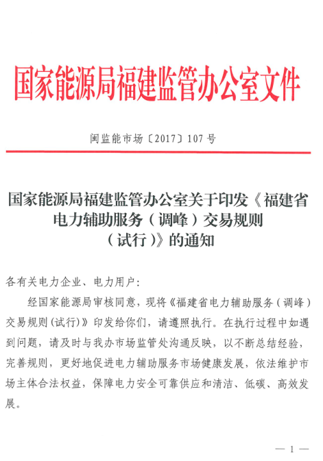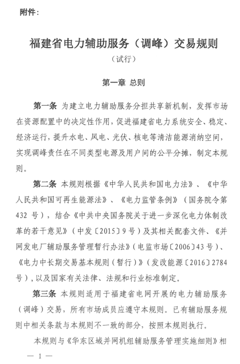 國家能源局福建監(jiān)管辦日前印發(fā)了《福建省電力輔助服務(wù)(調(diào)峰)交易規(guī)則(試行)》。規(guī)則試行于福建省電網(wǎng)開展的電力輔助服務(wù)(調(diào)峰)交易。本規(guī)則與《華東區(qū)域并網(wǎng)機(jī)組輔助服務(wù)管理實(shí)施細(xì)則》相銜接,不重復(fù)考核或