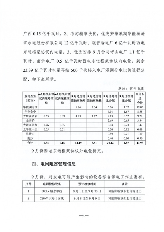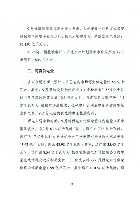 西電東送市場方面,9月份西電東送框架協(xié)議內(nèi)電量為87.6億千瓦時(其中,送廣東70.6億千瓦時,送廣西17億千瓦時)