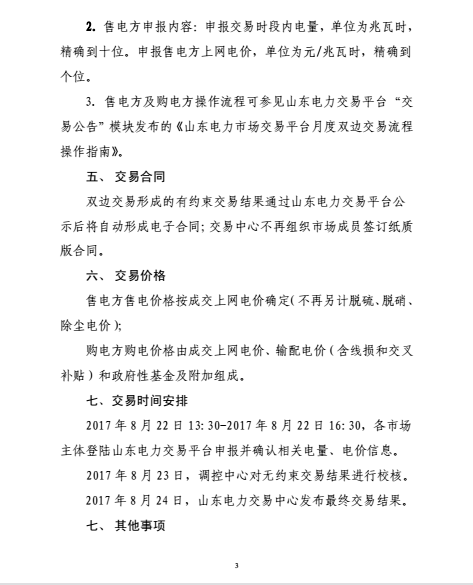 山東電力交易中心8月21日發(fā)布了山東省2017年9月電力直接交易(雙邊協(xié)商)公告,公告中稱(chēng),將于8月22日13:30-16:30開(kāi)展山東省2017年9月電力直接交易(雙邊協(xié)商),交易價(jià)格為售電方售電價(jià)格按成交上網(wǎng)電價(jià)確定(