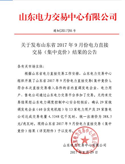 從山東電力交易中心獲悉,山東電力交易中心日前發(fā)布了關于山東省2017年9月份電力直接交易(集中競價)結果的公告。29家統(tǒng)調發(fā)電企業(yè)(60臺發(fā)電機組)與13家電力用戶及29家售電公司達成交易電量4.5348億千瓦時,統(tǒng)一出清價為388.5元/兆瓦時。具體公告如下: