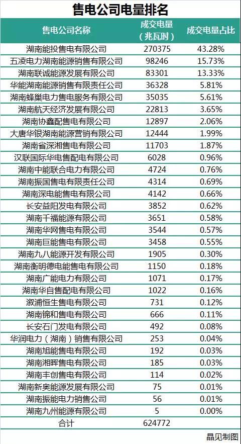 售電公司的成交電量中,湖南能投售電有限公司的成交電量排名第一,成交電量為270375兆瓦時(shí),占售電公司總成交電量的43.28%。目前來看,平均成交價(jià)差最大的外購(gòu)電交易中,湖南省國(guó)資委下屬的售電公司占了很大的優(yōu)勢(shì)。而第二名的五凌電力湖南能源銷售有限公司則是中國(guó)電力國(guó)際發(fā)展有限公司和湖南省國(guó)資委的合資售電公司,而第三名湖南聯(lián)誠(chéng)能源發(fā)展有限公司則是一家民營(yíng)售電公司。