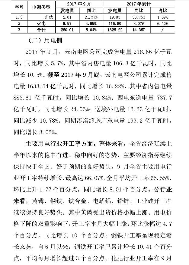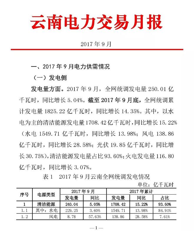 2017年9月,云南省內市場共成交電力61.72億千瓦時,同比增長16.13%,年度、月度、日前交易電量比例為19.14%、79.78%、1.08%,平均成交價0.11348元/千瓦時。截止2017年9月底,云南省內市場共成交電量500.81億千瓦時,同比增長21.06%,年度、月度、日前交易電量比例為28.71%、67.08%、4.21%,平均成交價0.18340元/千瓦時。