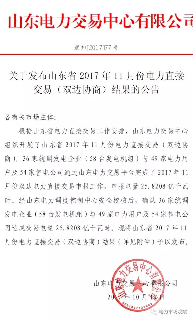 山東:2017年11月雙邊協(xié)商交易結(jié)果,成交電量25.8208億千瓦時(shí)!
