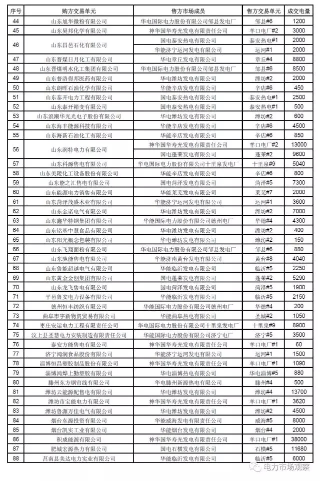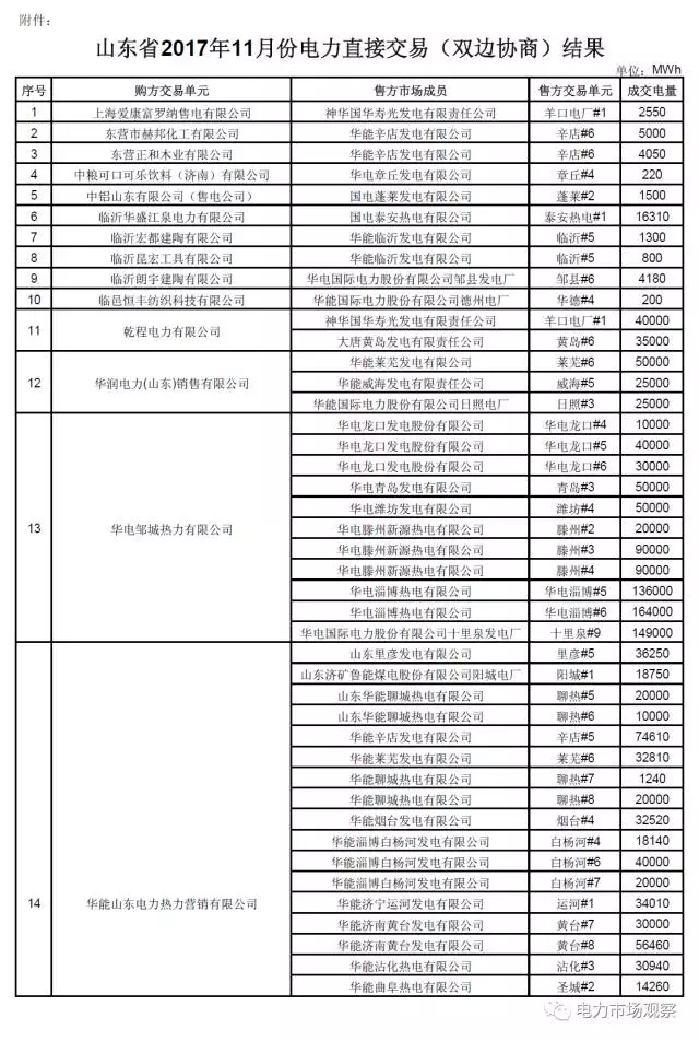 公告中稱(chēng):經(jīng)山東電力調(diào)度控制中心安全校核后,確認(rèn)36家統(tǒng)調(diào)發(fā)電企業(yè)(58臺(tái)發(fā)電機(jī)組)與49家電力用戶及54家售電公司達(dá)成交易電量25 8208億千瓦時(shí)。一起來(lái)看數(shù)據(jù)統(tǒng)計(jì):山東省2017年11月雙邊協(xié)商交易結(jié)果(按成交電