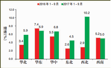 “一帶一路”、京津冀協(xié)同發(fā)展、長江經(jīng)濟帶三大發(fā)展戰(zhàn)略加快推進,區(qū)域協(xié)同發(fā)展成效進一步顯現(xiàn)。前三季度,華北、華中、華東、東北、西北、西南區(qū)域用電增速分別為6.7%、6.9%、6.8%、4.5%、10.1%、5.4%。其中西北地區(qū)用電增速最高,增速同比上升7.3個百分點,主要是受高耗能用電恢復(fù)拉動;華東、西南增速同比下降0.5、0.2個百分點,主要受上年高溫導致基數(shù)較高影響;華北、華中、東北分別上升2.5、1.3、1.9個百分點。