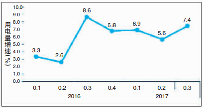 前三季度,國家電網(wǎng)經(jīng)營區(qū)全社會用電量約3.73億千瓦時,同比增長6.7%,增速同比上升1.7個百分點,增速創(chuàng)2014年以來同期新高。分季度看,2017年一、二、三季度增速分別為6.9%、5.6%、7.4%,一、二季度增速同比分別上升3.6、3.1個百分點,三季度增速同比下降1.2個百分點。據(jù)測算,今年6~8月的降溫電量接近2200億千瓦時,增幅接近29%。若剔除高溫因素,前三季度用電量同比增長5.6%,增速仍高出去年同期1.8個百分點,顯示我國經(jīng)濟繼續(xù)保持穩(wěn)中向好的發(fā)展態(tài)勢,前三季度GDP增速為6.9%,比上年同期提高了0.2個百分點。