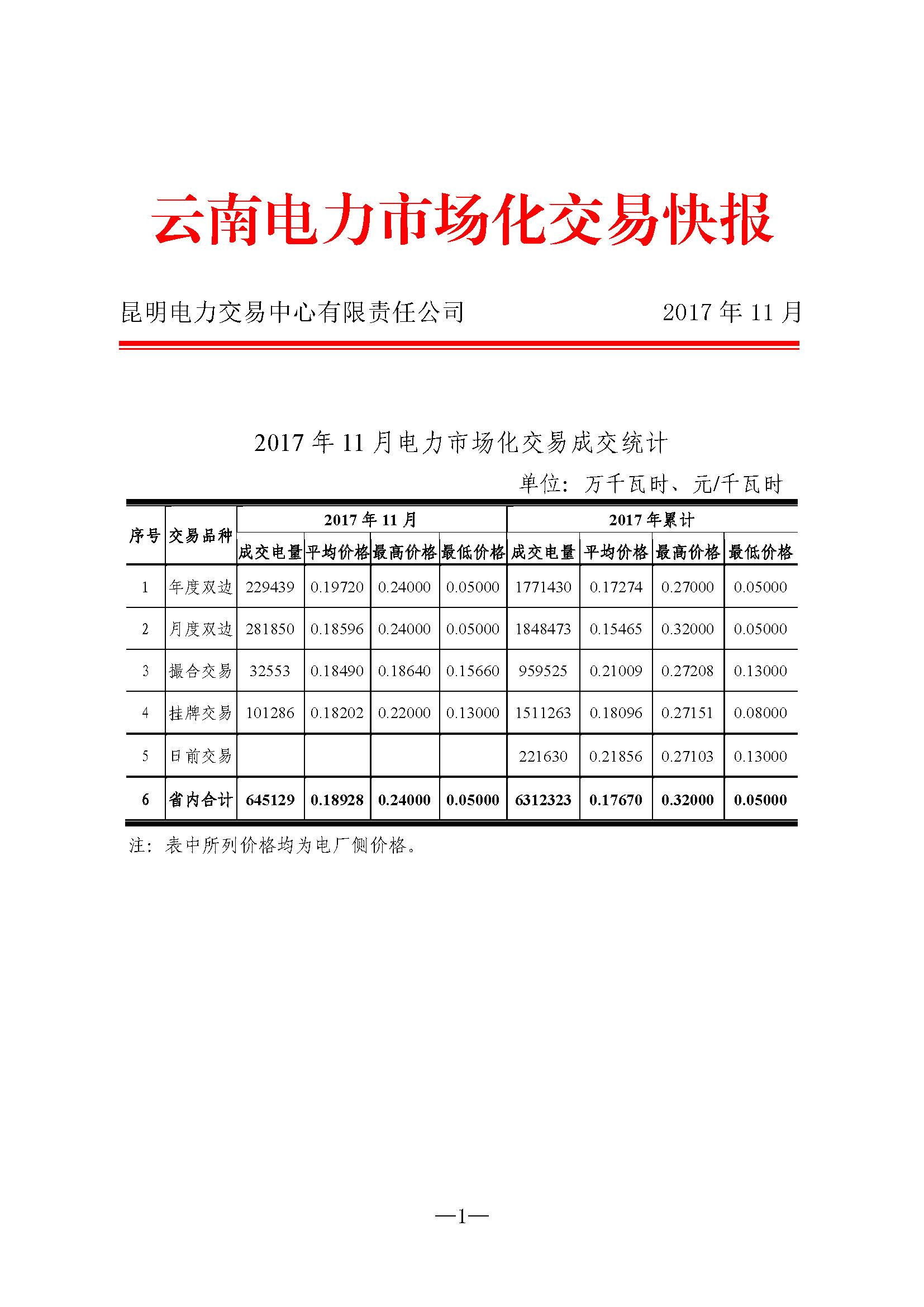 云南電力市場(chǎng)化交易快報(bào)(2017年11月)