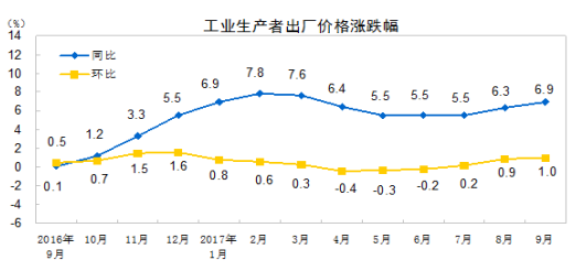 國(guó)家統(tǒng)計(jì)局公開數(shù)據(jù)顯示,2017年9月,工業(yè)生產(chǎn)者出廠價(jià)格指數(shù)(PPI)同比上漲6.9%,環(huán)比上漲1.0%。