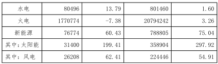 (一)發(fā)電量情況。10月份當(dāng)月,全省發(fā)電量192.8億千瓦時(shí),同比減少5.04%。其中水電8.05億千瓦時(shí),同比增加13.79%;火電177.08億千瓦時(shí),同比減少7.38%;新能源7.68億千瓦時(shí),同比增長(zhǎng)60.43%。