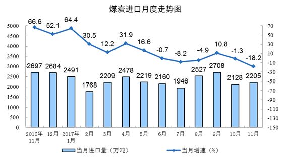 11月份,進(jìn)口煤炭2205萬噸,同比下降18.2%,降幅比10月份擴(kuò)大16.9個百分點(diǎn)。1-11月份,進(jìn)口煤炭2.5億噸,同比增長8.5%。