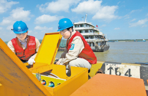 供電員工檢查張家港報(bào)稅港區(qū)港務(wù)有限公司1號(hào)泊位岸電箱。王超 攝