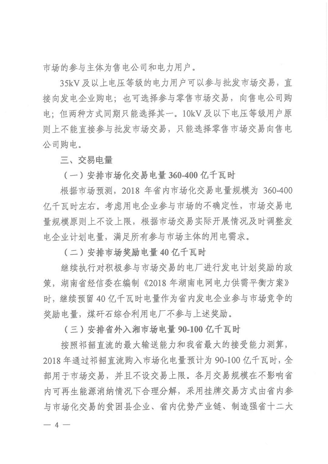 湖南省經(jīng)信委日前發(fā)布了《關(guān)于組織開展2018年電力市場交易的通知》,在方案中,湖南市場化交易電量規(guī)模為360-400億千瓦時左右。