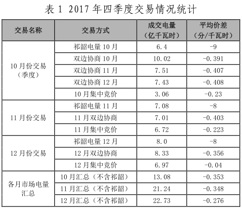 表 1 2017 年四季度交易情況統(tǒng)計(jì)