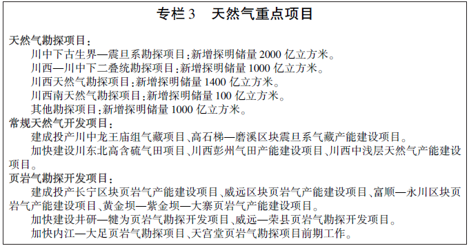 加快推動(dòng)川中、川西和川東北常規(guī)天然氣勘探開(kāi)發(fā),川南頁(yè)巖氣資源調(diào)查和勘探開(kāi)發(fā)。到2020年,新增常規(guī)天然氣探明儲(chǔ)量6500億立方米,天然氣產(chǎn)量達(dá)到450億立方米(其中頁(yè)巖氣100億立方米)。