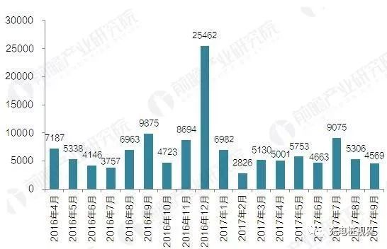 從月度變化來看,自2016年10月到2017年9月,月均新增公共類充電設(shè)施約7349個,2017年9月同比增長86.1%。