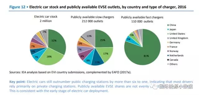 根據(jù)國(guó)際能源署(IEA)近期發(fā)布的“2017年全球電動(dòng)汽車展望”報(bào)告中的數(shù)據(jù),2016年底全球電動(dòng)汽車總數(shù)達(dá)到200萬輛,其中中國(guó)占32%、美國(guó)28%。同期全球共有21.2萬向公眾開放的慢速充電接口,其中中國(guó)占25%、美國(guó)17%;11萬快速公共充電接口,中國(guó)占到81%,日本、美國(guó)各占5%。