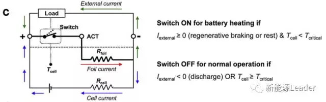 該技術(shù)的核心是自加熱電池,該電池設計如上圖所示,需要在電池內(nèi)部置入兩片Ni片,每片Ni片的阻抗為78mW,分別放置在電池的1/4和3/4厚度處,兩片Ni片之間以并聯(lián)形式連接在一起,并通過一個開關(guān)與正負極連接在一起,用于控制鋰離子電池的是否加熱。Guangsheng Zhang在上述自加熱電池的基礎(chǔ)上設計了控制方案,能夠根據(jù)電動汽車的負載情況控制加熱開關(guān)的開啟和關(guān)閉。