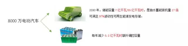 一是車載電池,按照2030年全國電動(dòng)汽車保有量達(dá)到8000萬輛的預(yù)測,電動(dòng)汽車每年充電需求將達(dá)到4100億千瓦時(shí),理論儲(chǔ)能容量達(dá)到7億千瓦/55億千瓦時(shí),其功率儲(chǔ)能的容量約為目前全國抽水蓄能裝機(jī)量的27倍。2030年風(fēng)電,光伏發(fā)電電量將達(dá)到42.1億千瓦時(shí),則僅電動(dòng)乘用車的有效儲(chǔ)能容量即可滿足97%波動(dòng)性可再生能源日發(fā)電量的存儲(chǔ),如果電動(dòng)汽車能夠有序充放電,則可以減少額外投資而獲得的巨大調(diào)控容量。