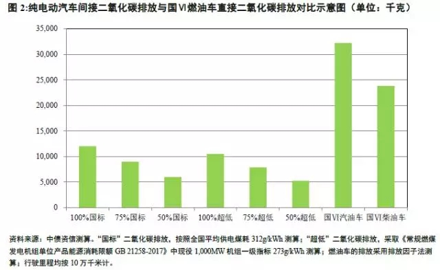 另外一個(gè)方面,從溫室氣體排放的角度測(cè)算,火電機(jī)組分別按照2016年全國(guó)供電煤耗312g/kWh和最新國(guó)家標(biāo)準(zhǔn)《常規(guī)燃煤發(fā)電機(jī)組單位產(chǎn)品能源消耗限額GB21258-2017》中現(xiàn)役1,000MW機(jī)組一級(jí)指標(biāo)273g/kWh進(jìn)行測(cè)算。測(cè)算結(jié)果如圖2所示,純電動(dòng)汽車的二氧化碳間接排放,亦顯著低于燃油車輛的直接排放,這與火電廠能源利用效率高于普通車輛的燃油發(fā)動(dòng)機(jī)有關(guān),而柴油車比汽油車更高的熱效率也反映在柴油車更低的二氧化碳排放水平上。