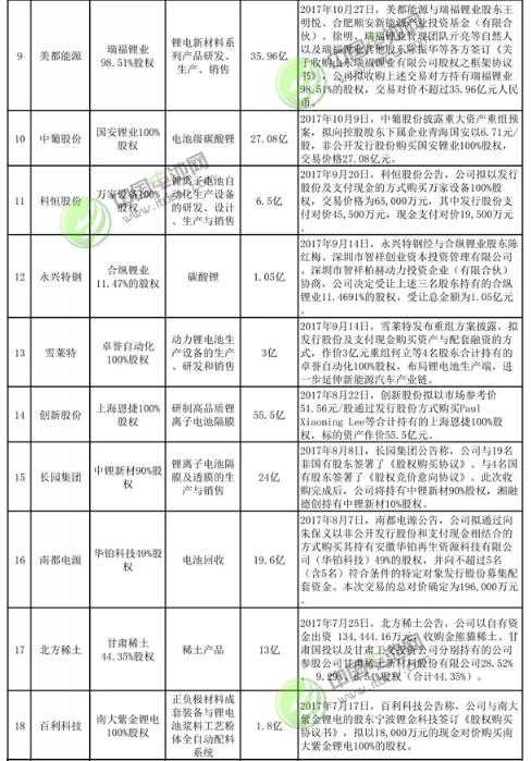 2017年,鋰電池產(chǎn)業(yè)鏈也可謂“并購兇猛”的一年。受動力鋰電池需求激增影響,隨之而來的正極材料、負(fù)極材料、隔膜、電解液及鋰資源,產(chǎn)業(yè)鏈之間的合作聯(lián)動愈發(fā)明顯。企業(yè)紛紛通過重組并購加入戰(zhàn)場,開始一場“分羹行動”。