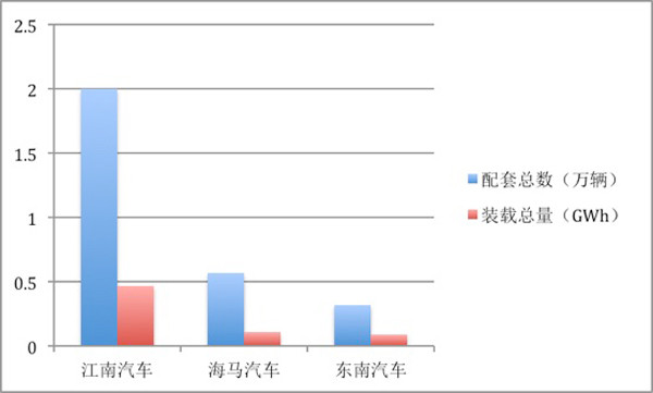 2017年,比克動力電池配套總數(shù)為3.44萬輛,江南汽車配套裝機數(shù)量最多為2萬輛;裝機總量為0.84GWh,江南汽車排名第一,裝機量達(dá)0.47GWh。