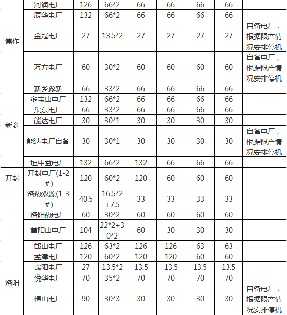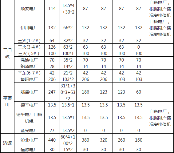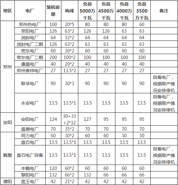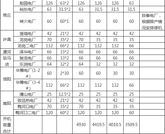 近日河南省發(fā)改委印發(fā)了《關(guān)于做好2017-2018年度采暖季電力綠色調(diào)度有關(guān)工作的通知》。文件指出,自2017年11月15日-2018年3月15日,根據(jù)省網(wǎng)3500萬千瓦至5000萬千瓦不同用電負(fù)荷水平,執(zhí)行階梯開機(jī)方案根據(jù)電、熱負(fù)荷實(shí)際適時(shí)調(diào)整開機(jī)方案。建立電煤保障機(jī)制,強(qiáng)化電煤保供考核,對(duì)月度履約率明顯偏低、季度履約率低于80%的煤炭、發(fā)電企業(yè)實(shí)施約談通報(bào);電煤年度合同簽約量占比低于75%或全年履約率低于90%的,對(duì)發(fā)電企業(yè)按每噸1000千瓦時(shí)的標(biāo)準(zhǔn)核減計(jì)劃電量,按以罰定獎(jiǎng)的原則,獎(jiǎng)勵(lì)簽約、履約完成較好的發(fā)電企業(yè);建立電煤合同履約信用記錄,定期公布合同履約情況,實(shí)施守信聯(lián)合激勵(lì)和失信聯(lián)合懲戒措施。其中,采暖季統(tǒng)調(diào)公用燃煤機(jī)組階梯開機(jī)容量合計(jì)16869.5萬千瓦,具體情況如下: