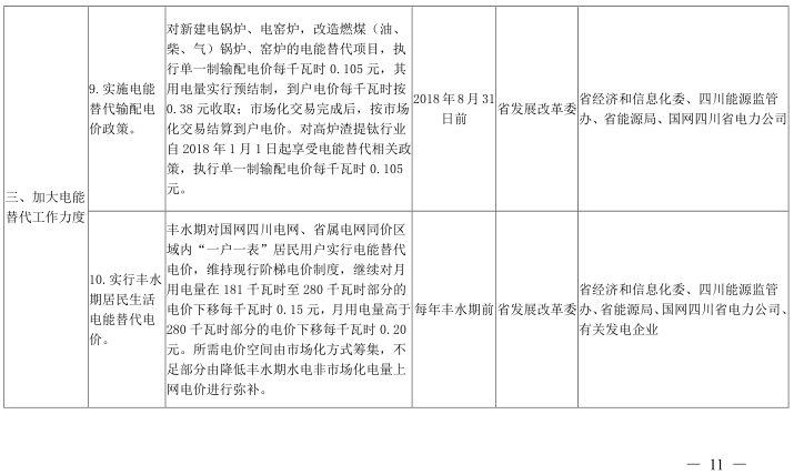 9.實(shí)施電能替代輸配電價(jià)政策。對(duì)新建電鍋爐、電窯爐,改造燃煤(油、柴、氣)鍋爐、窯爐的電能替代項(xiàng)目,執(zhí)行單一制輸配電價(jià)每千瓦時(shí)0.105元,其用電量實(shí)行預(yù)結(jié)制,到戶電價(jià)每千瓦時(shí)按0.38元收取;市場(chǎng)化交易完成后,按市場(chǎng)化交易結(jié)算到戶電價(jià)。對(duì)高爐渣提鈦行業(yè)自2018年1月1日起享受電能替代相關(guān)政策,執(zhí)行單一制輸配電價(jià)每千瓦時(shí)0.105元。