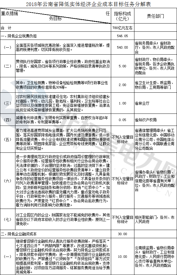 2018 年云南省降低實體經(jīng)濟(jì)企業(yè)成本目標(biāo)任務(wù)分解表