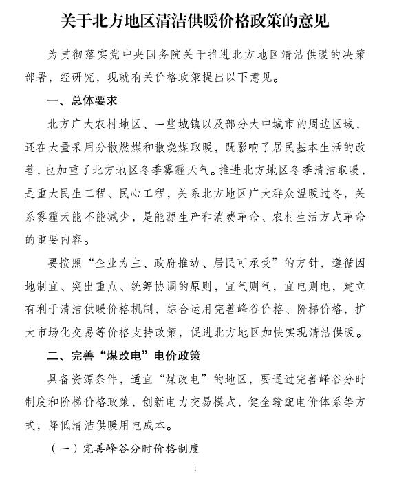 2017年9月25日,國(guó)家發(fā)改委發(fā)布《關(guān)于印發(fā)北方地區(qū)清潔供暖價(jià)格政策的意見》。涉及“煤改電”電價(jià)政策部分,《意見》中提出:具備資源條件,適宜“煤改電”的地區(qū),要通過(guò)完善峰谷分時(shí)制度和階梯價(jià)格政策,創(chuàng)新電力交易模式,健全輸配電價(jià)體系等方式,降低清潔供暖用電成本。