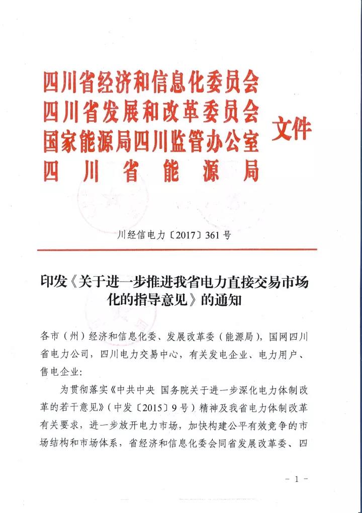 四川省經(jīng)信委、四川省發(fā)改委、國家能源局四川監(jiān)管辦、四川省能源局日前聯(lián)合下發(fā)了《關(guān)于進一步推進我省電力直接交易市場化的指導(dǎo)意見》。意見中稱,將規(guī)范完善直購電的相關(guān)扶持政策,擴大發(fā)電企業(yè)參與電力市場范圍,全面放開售電公司參與電力市場,穩(wěn)步推進進商業(yè)用戶進入電力市場,積極開展產(chǎn)業(yè)園區(qū)直接交易試點,穩(wěn)妥開展跨省跨區(qū)富余可再生能源電力現(xiàn)貨交易試點,放開地方電網(wǎng)(躉售區(qū))進入直接交易市場,有序推進其他特殊行業(yè)企業(yè)完全電力市場化。詳情如下: