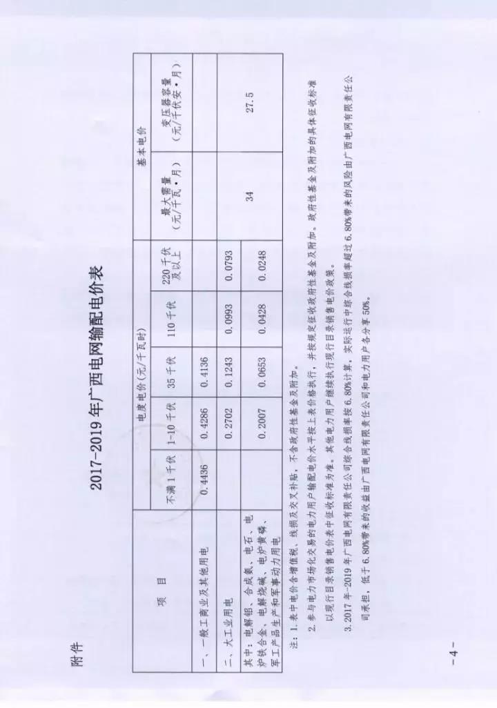 廣西電網2017-2019年輸配電價表