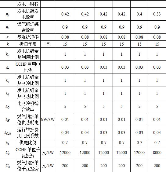 根據電能自發(fā)自用、余熱利用最大化、冷熱電平衡的原則,由判別式Ⅳ和Ⅶ求得中值Peavg,從而解得了燃氣發(fā)電機組的最佳容量,即判別式Ⅷ為: