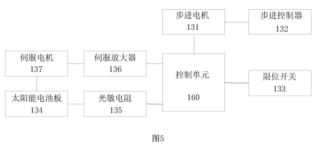 進一步地,所述光伏發(fā)電單元還包括太陽能電池板、光敏電阻、伺服放大器以及伺服電機,所述光敏電阻設置于所述太陽能電池板,所述伺服放大器分別與所述伺服電機和所述控制單元連接,所述伺服電機與所述太陽能電池板連接;