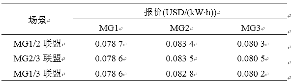 表2 聯(lián)盟場(chǎng)景下微電網(wǎng)的報(bào)價(jià)