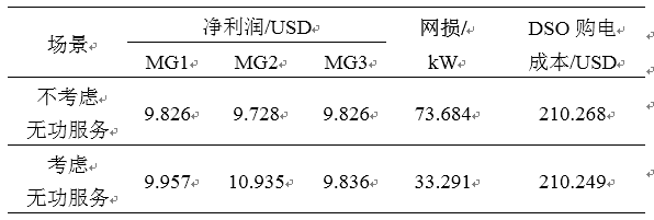 在上述的仿真分析中,僅考慮了微電網(wǎng)運(yùn)營(yíng)商參與有功功率競(jìng)價(jià)的過(guò)程。實(shí)際上,微電網(wǎng)運(yùn)營(yíng)商除了能夠提供有功功率之外,還能夠通過(guò)提供無(wú)功功率服務(wù)進(jìn)一步優(yōu)化系統(tǒng)的潮流,降低網(wǎng)絡(luò)損耗,同時(shí)依靠無(wú)功功率服務(wù)獲取一定的收益。